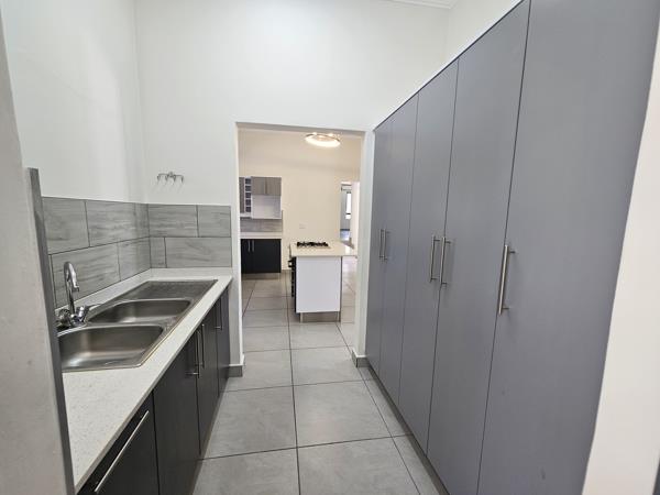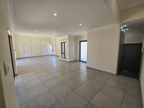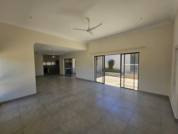 The spacious living room, bathed in natural light thanks to the large windows and doors that open onto an inviting undercover patio with a built-in braai.