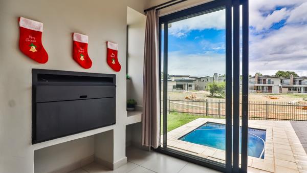 This home has three bedrooms and two bathrooms, making it ideal for a family. The open-plan living space connects to a stylish kitchen with a handy scullery. Step outside onto the patio with a built-in braai, perfect for relaxing or hosting friends. The patio leads to a large garden with a sparkling pool, where kids can play and have fun.