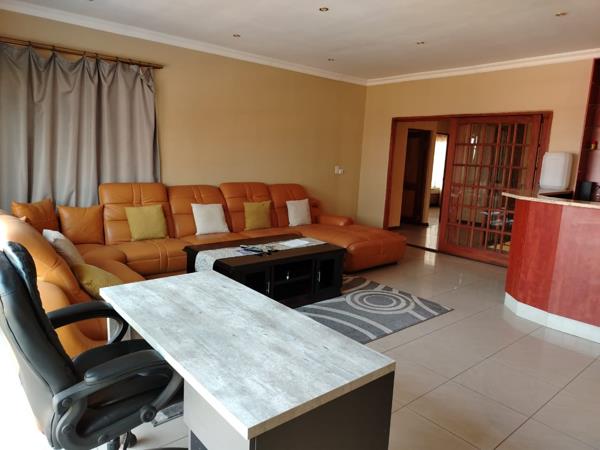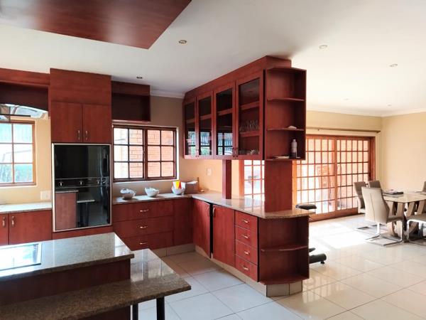The open-plan dining and living areas seamlessly connect to a covered patio, complete with a built-in braaiperfect for year-round entertaining. The patio overlooks a splash pool and garden, creating an ideal indoor-outdoor flow.