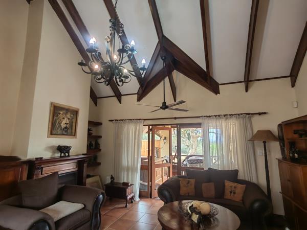The lounge on the left offers high open wooden beam ceilings fitted with a custom-made wrought iron chandelier. It has a built-in fireplace and the most amazing solid wood mantlepiece. Sliding doors open to a veranda with stunning views of the garden and the legendary Lions Head look-out.