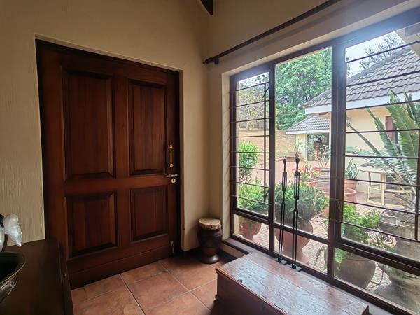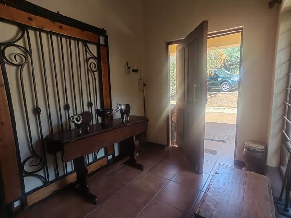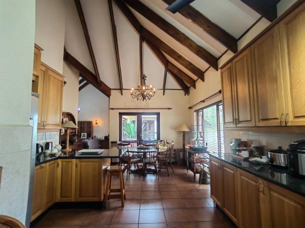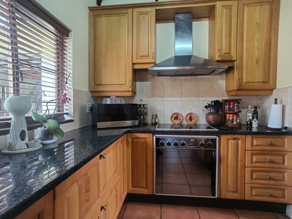 The open plan kitchen and dining area flows from the lounge following earthy tone tiles and wood. All kitchen countertops are fitted with polished granite complimenting the wooden built-in cupboards. Adjoining the kitchen is the laundry and scullery plus servants quarters which includes a shower and toilet. A double garage with direct access to the house.