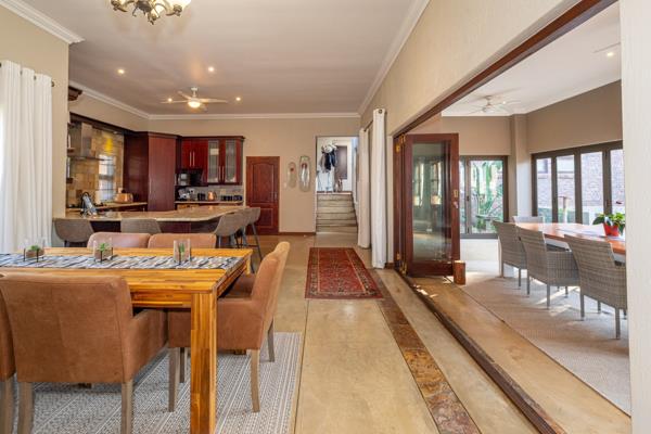 The open-plan lounge and dining area flow seamlessly onto a spacious enclosed patio, featuring stackable doors that can be opened in summer or closed in winter for year-round enjoyment. This area overlooks a sparkling pool, complete with a secure, solid pool cover, ideal for families with young children.