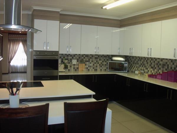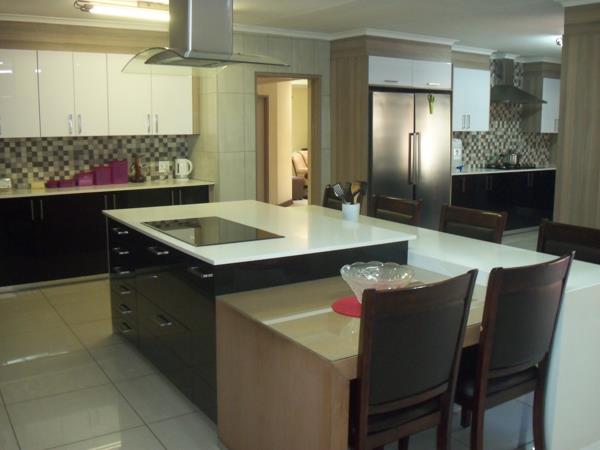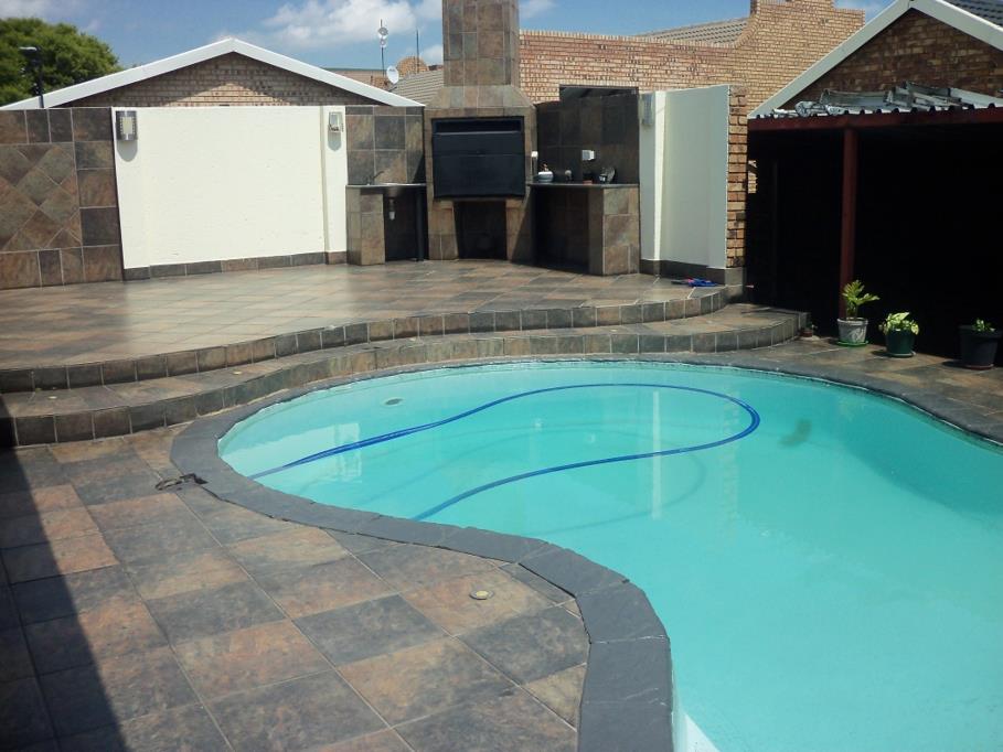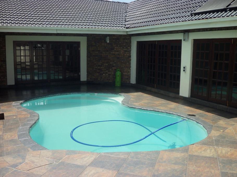 Flowing living areas with natural light derived from skylights. Formal lounge is fitted with a wood fireplace and the family lounge a gas fireplace. The gourmet kitchen boast an extended centre island and breakfast nook for that intimate family dining time. A double eye-level oven and a gaselectric hob. The main bedroom aircon has a walk in closet and full en-suite bathroom. The second bedroom also with en-suite bathroom. Both are on the left wing of the house. Following the passage to the opposite wing one find two more bedrooms sharing the family bathroom and a fifth bedroom aircon with en-suite bathroom. The entertainment area have doors leading to the heated swimming pool, braai area with outside shower. The entertainment area boast a bar, Pool table and Jacuzzi. Adjacent to the entertainment area is a guest suite with en-suite bathroom and kitchenette.