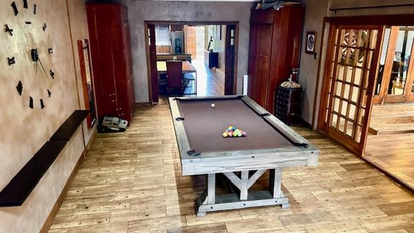 The vast open plan living space encapsulates the modern, cosey kitchen with free standing gas reticulated SMEG stove and separate scullery area. All the living areas interlead with one another and interior doors can be left open to create a vast area or closed off individually to create a sense of warmth or privacy. The lounge has a gas reticulated fireplace and opens into the entertainment area which has a built in indoor braai. The entertainment area opens up to the back garden and swimming pool or to the billiard room.