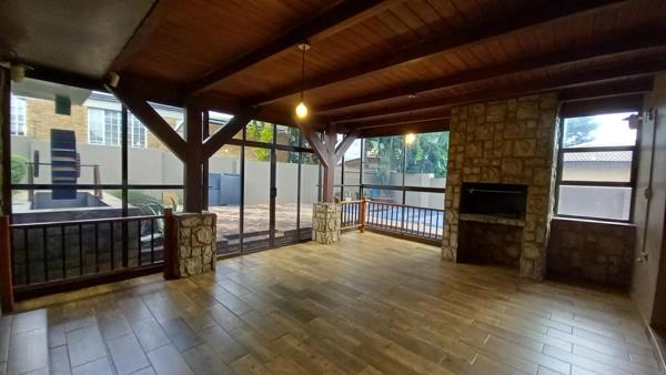 Floor-to-ceiling tinted glass creates a sleek, modern atmosphere while stacking doors lead to a generous entertainment space with a built-in braai. From here, sliding doors open to a heated pool, allowing for year-round enjoyment.