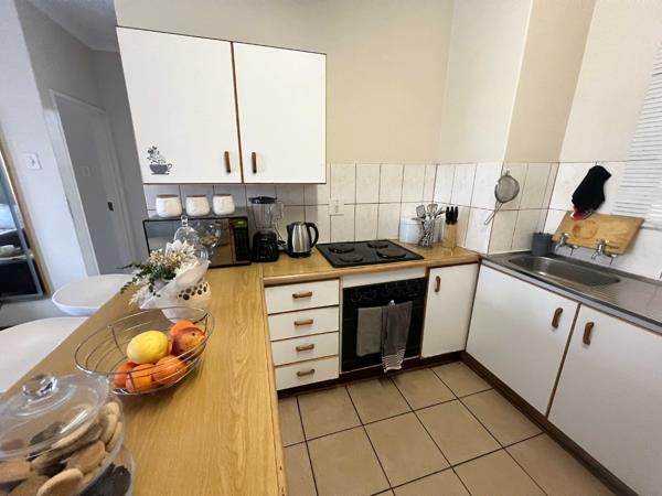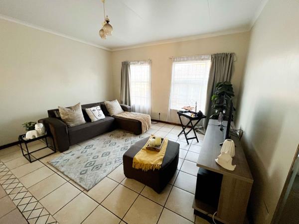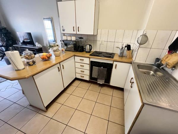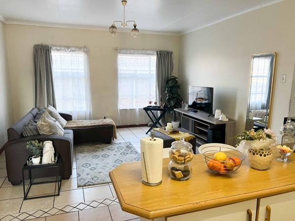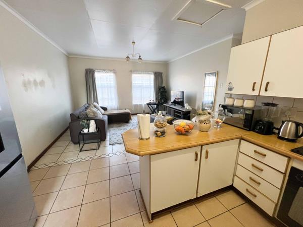 This inviting 72 sqm residential unit in Aerorand, Middelburg, offers a practical and comfortable living experience. The open-plan layout seamlessly connects the living area and kitchen, creating a bright and airy space. Large windows allow ample natural light to fill the room, complemented by a neutral colour palette and durable tiled flooring throughout, ensuring easy maintenance. The functional kitchen features white cabinetry, wood-look countertops, an integrated oven and stove, and a convenient peninsula counter, ideal for meal preparation or as a breakfast bar.