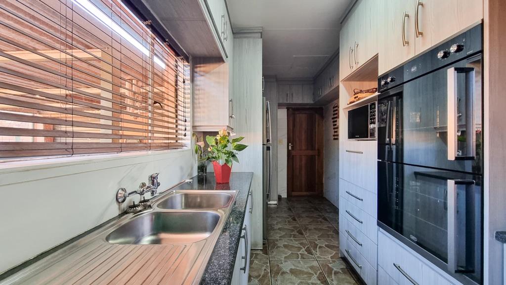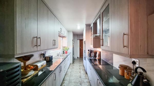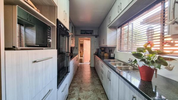 Upon entering, you are greeted by a modern, newly renovated kitchen featuring granite countertops, ample cupboard space, a double eye-level oven, electric hob, and extractor fan for your convenience. Adjacent to the kitchen is a spacious open-plan lounge and dining area, flowing effortlessly into the large entertainment lapa. This versatile space is perfect for hosting unforgettable family gatherings and includes a built-in braai, bar, and practical storage with shelving.