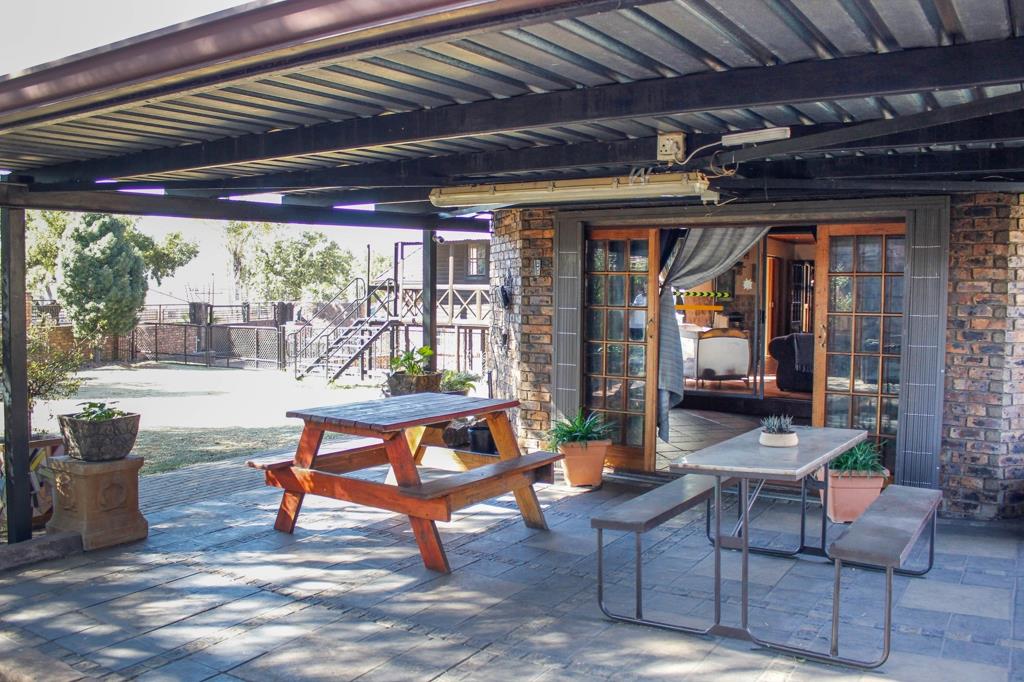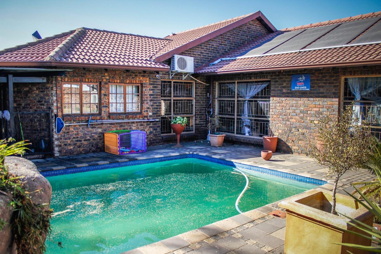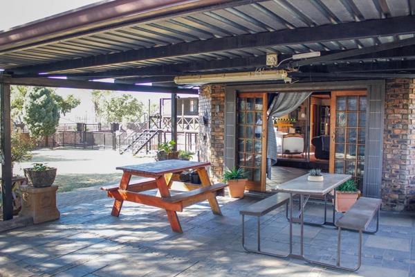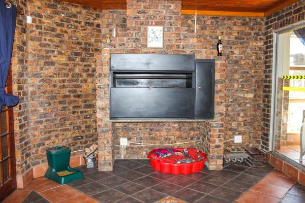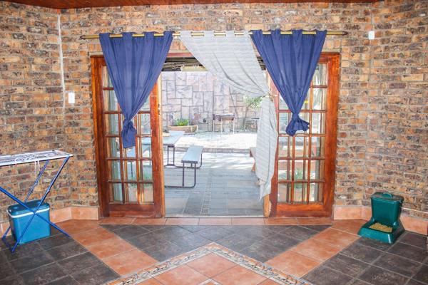 As you step inside, youre greeted by a spacious open-plan living room and kitchen, designed to bring the family together. The living room exudes warmth, featuring an air conditioner and large sliding doors that lead to a sun-kissed entertainment area. Whether youre hosting friends or enjoying a quiet weekend with loved ones, the built-in braai and cozy atmosphere make this the heart of the home. The entertainment area flows beautifully through wooden sliding doors to a covered patio and sparkling swimming pool with a tranquil water featurean idyllic spot for hot summer days and weekend gatherings.
