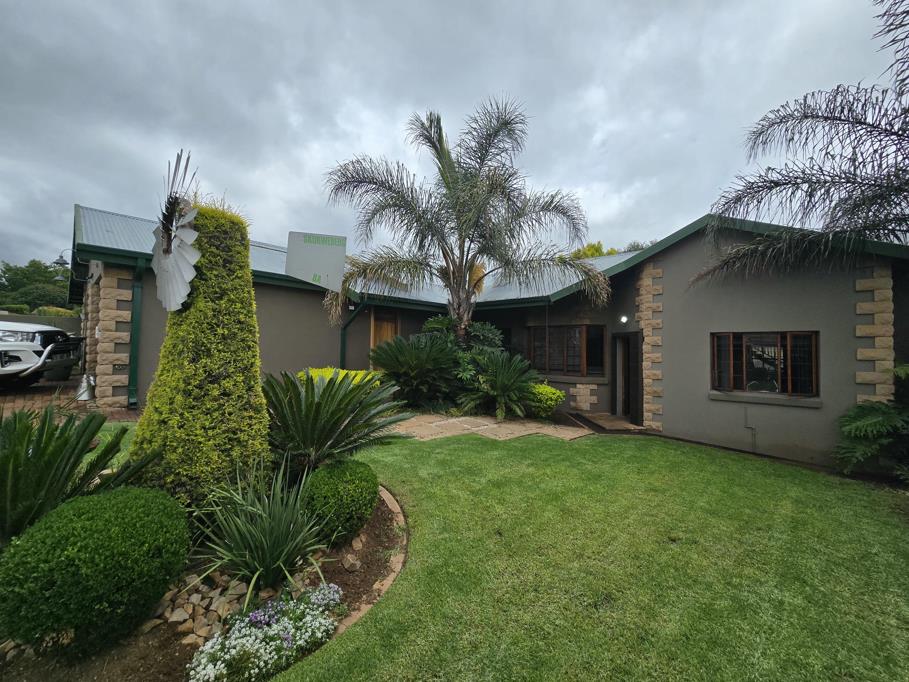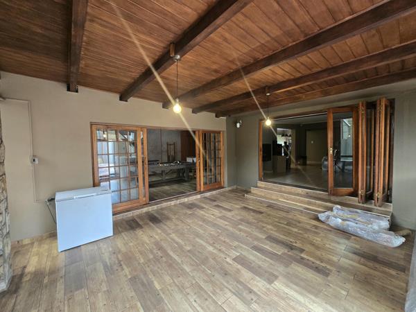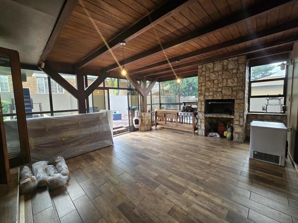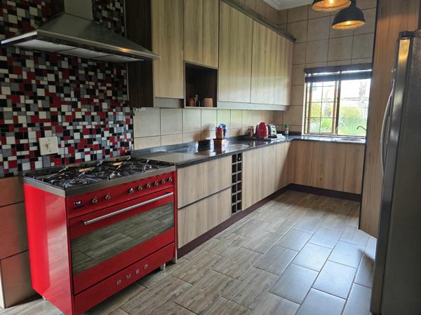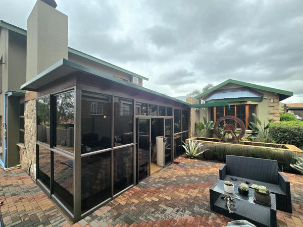 The open-plan layout seamlessly connects a cozy lounge with a gas fireplace, an expansive family room, and a dining space adorned with sliding barn doors all leading to a chef-worthy kitchen featuring granite countertops, wood cabinetry, and a premium SMEG 6-burner gas stove. A separate scullery add everyday convenience. The enclosed braai room framed in tinted glass and stacking doors is the true heart of the home, flowing out to a heated pool and a lush, landscaped garden complete with a windmil and waterwheel for that serene, shows topping touch.