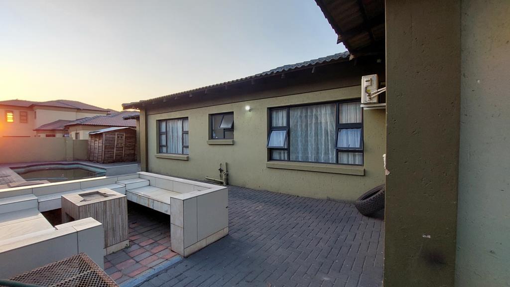 Step outside to a spacious open patio overlooking a swimming pool and a boma. Additional features include a Wendy house for storage and an automated garage door for convenience.