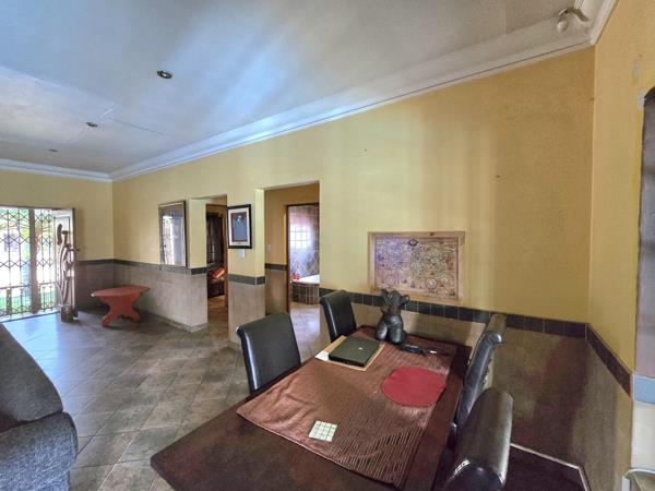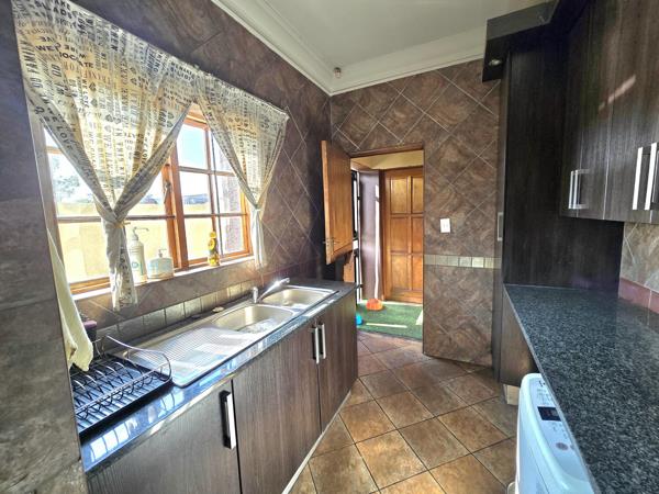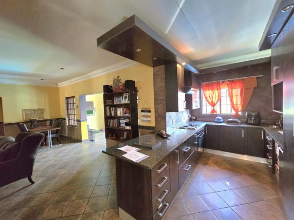 The heart of this home is its open-plan design, where the kitchen, scullery, dining area, lounge, and entertainment space all flow seamlessly together. The kitchen includes a dedicated scullery for extra convenience, while the built-in braai in the entertainment area creates the perfect setting for hosting family and friends. Large doors open to a sparkling swimming pool surrounded by neat astroturf, making the outdoor area both inviting and low-maintenance.
