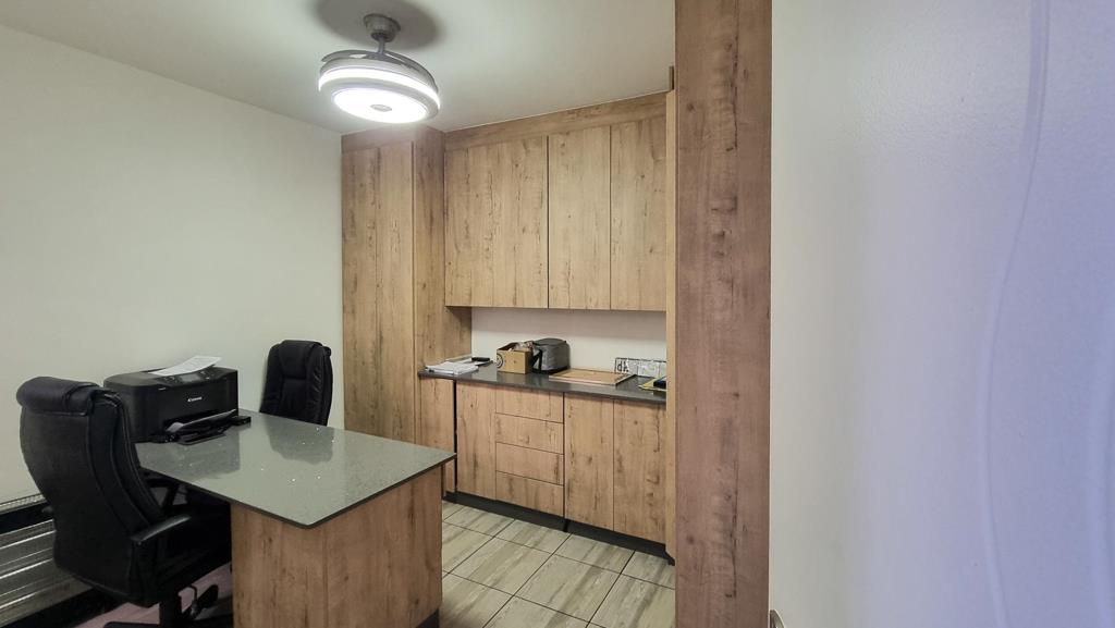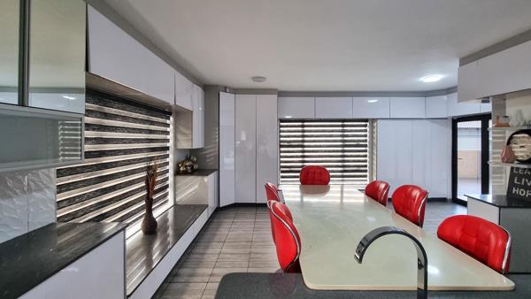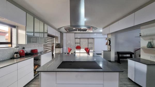 At the heart of the home, the modern kitchen impresses with its high-gloss cabinetry, quartz countertops, and a sleek electric hob with extraction fan. A separate scullery, fitted with a gas stove and additional extractor, ensures the kitchen remains pristine and functional. A dedicated coffee or breakfast nook adds a warm, inviting touch to the space.