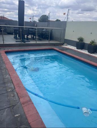A sparkling pool and covered patio