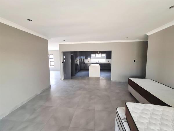 From the moment you arrive, the motorised double garage with aluminium doors and extra length makes a bold statement of modern elegance. The patio cladding and sleek pillars enhance the homes striking exterior, while the aluminium swivel entrance door welcomes you into a light-filled, open-concept interior. Large grey tiles flow seamlessly throughout, adding a sense of continuity and refined style.