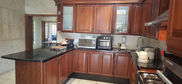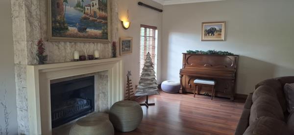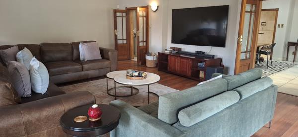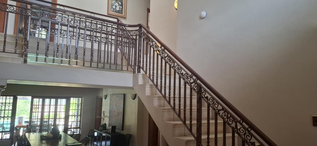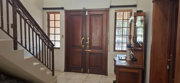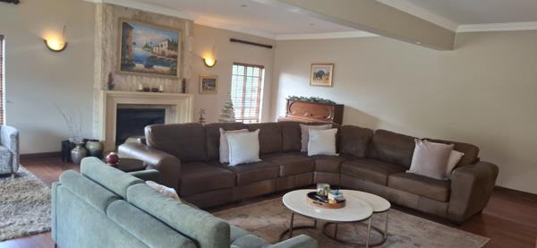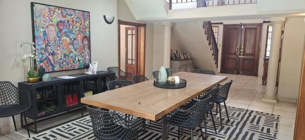 First impression, a grand double-volume foyer with a sweeping staircase, leading into sun-drenched living areas. The open-plan dining area flows effortlessly to a covered patio overlooking the sparkling pool and lushes garden. A spacious lounge with charming fireplace provides the perfect setting for elegant gatherings. The TV lounge cater for those family members who wish to watch their own channels. The gourmet kitchen features granite countertops, ample Rosewood cabinetry, a walk-in pantry, a Smeg six-plate gas stove, built-in microwave, coffee machine and a breakfast nook. Separate laundry and scullery.