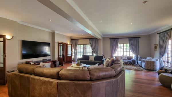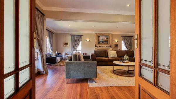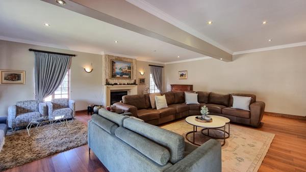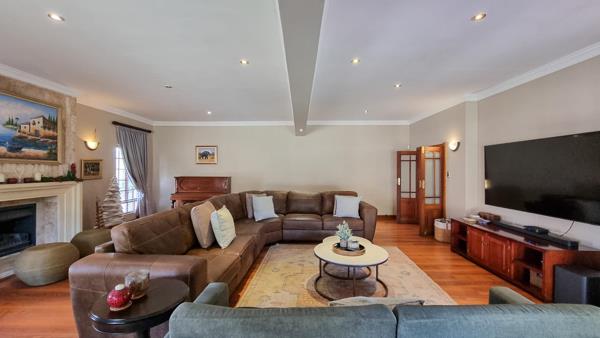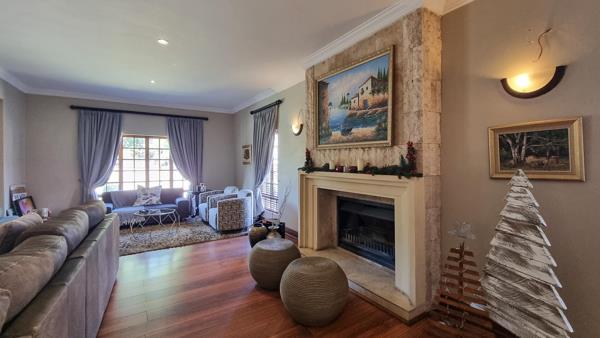 The gourmet kitchen is a culinary delight, featuring granite countertops, a SMEG gas stove, a built-in microwave and coffee machine, ample rosewood cabinetry, a pantry, and a separate scullery and laundry. A spacious lounge with a fireplace creates the perfect setting for cozy evenings or refined gatherings.