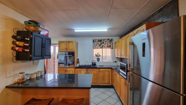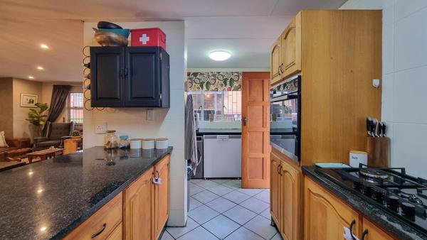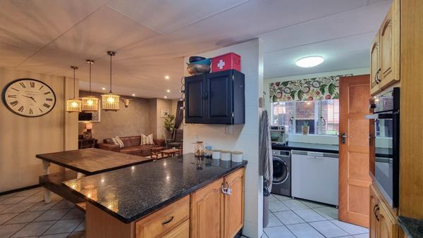 Step inside and be welcomed by a spacious open-plan living area that combines lounge and dining spaces seamlessly. The modern kitchen is a true highlight, featuring granite countertops, a breakfast island, an eye-level oven, gas hob, water filtration, and a separate scullery with room for all three appliances. Just outside, a private courtyard makes the perfect laundry area.