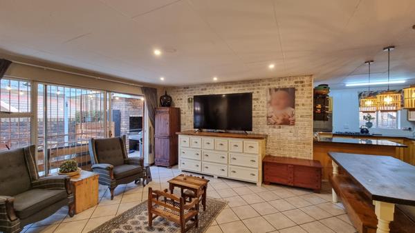 The living space flows effortlessly onto a covered patio with a louvre roof, a built-in braai, and plenty of room to relax while enjoying stunning sunsets.