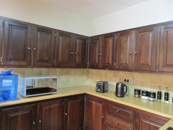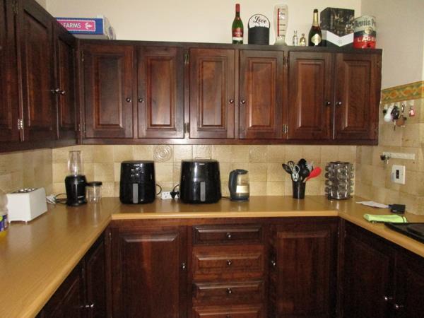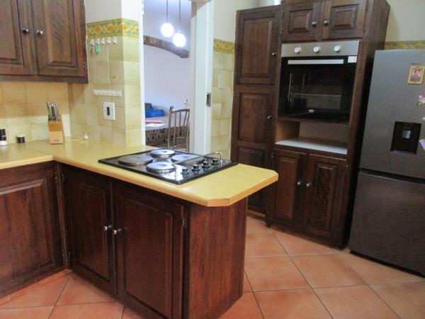 GROUND FLOOR: Open plan LoungeDining room with new carpets, Well planned Kitchen with eyelevel oven, stove and wooden cupboards with melamine finish, , Utility room and laundry, garage and carport with small well kept garden and clinker surrounding wall. Remote controlled entrance gate.