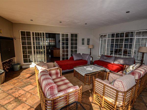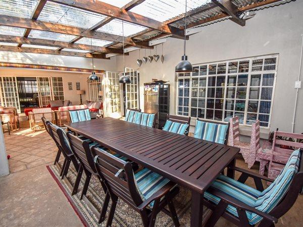 Step into a sun drenchedopen-plan dining and lounge area with a cozy fireplace and sliding doors leading to a covered patio, perfect for gatherings. Enjoy a built-in braai overlooking a sizeablepool.