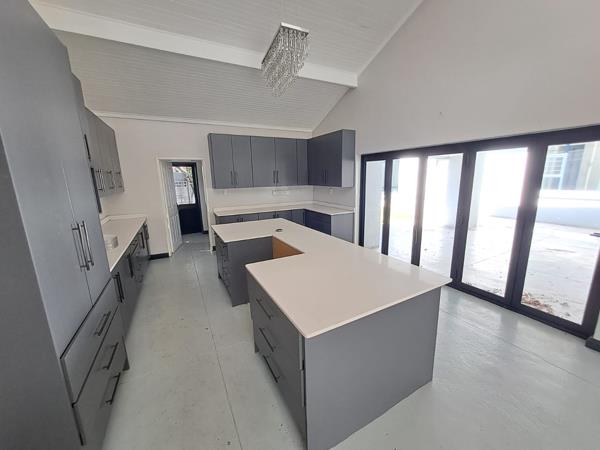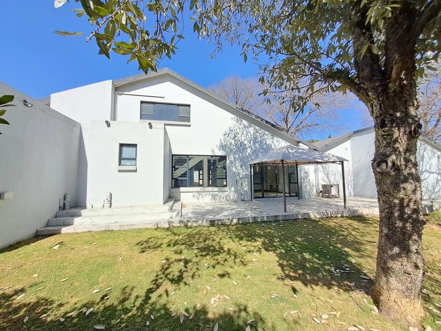 The modern kitchen boasts a timeless grey-and-white design, ample cupboard space, and room for a freestanding 6-plate gas stove and oven. A large scullery, fully fitted with connections for both dishwasher and washing machine, opens to a private courtyard that can easily transform into an alfresco dining area. A loft-style study overlooks the kitchen, while a guest toilet adds convenience.
