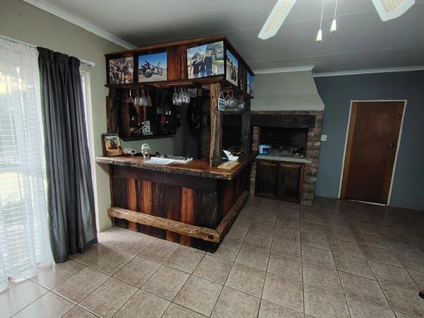 Entertaining area with sleeper bar and braai with sliding door that leads to the garden and pool.