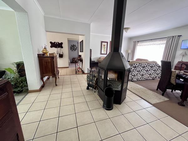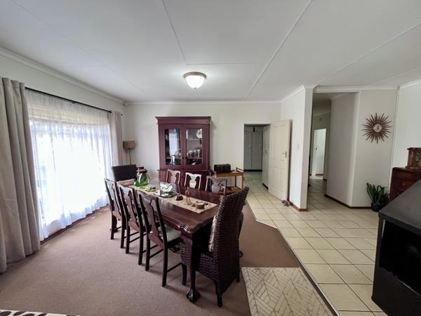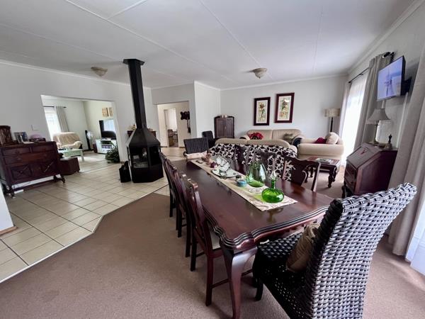 Boasting an impressive 420m2 of refined living space on a generous 1 504m2 erf, this home offers a harmonious blend of luxury and practicality. The spacious entrance hall welcomes you into an interior designed for stylish living, featuring an independent study with a wall-mounted fan, a guestroom with an en-suite bathroom comprising a shower, toilet, and basin. To the right, on your left, an open plan formal lounge and dining room, and on the right, a family TV room including an air conditioner. At the center of the rooms is a round, glass-paned, wood-fired fireplace, creating warmth during the cold winter months for all three areas.