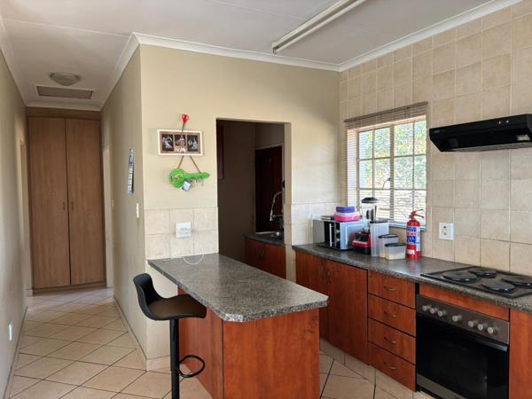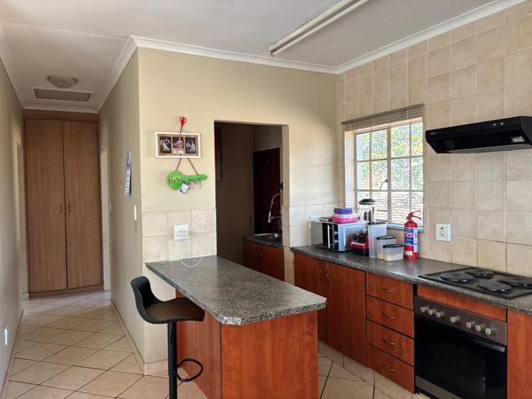 The homes open-plan layout includes a modern kitchen with a separate scullery, seamlessly connected to a large living areaperfect for entertaining. A built-in braai enhances the indoor-outdoor flow, making gatherings effortless.