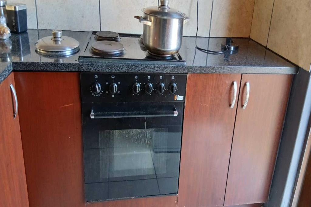 - Modern open-plan kitchen with wooden cupboards, electric stove with oven, and ample space for a large fridge and washing machine