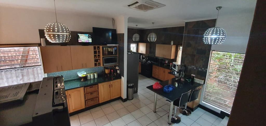 Simplex - Family Home. Featuring 3 spacious Living areas inside the house Plus an enclosed entertainment Area a few steps away from the main building with build-in braai, bar and lots of space. Open Plan Kitchen with build -in cupboards, stove and lots of space, scullery, laundry and Dining Room. Study, Main Bedroom En-suite, 3 guest bedrooms, family bathroom and jacuzzi in a sheltered corner. Burglar bars and 24 camera system. Swimming Pool with Glass, borehole surroundings, 3 lock -up garages, carports for 11 vehicles, electric fenced garden, paving, remote controlled gate, Alarm system, Bachelor flat .EXCLUDED: All the garden features, statues and loss flower pots. There is a camera system in the street for your safety.