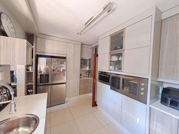 To the left A spacious dining room leading into a beautifully renovated kitchen featuring Whirlpool integrated appliances (microwave & eye-level oven), an inverter stovetop with a modern extractor hood, and a scullery with a built-in dish drying rack and space for a washing machine & dishwasher.