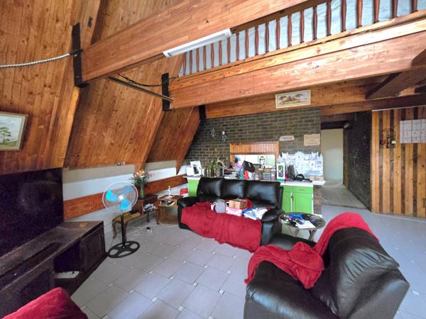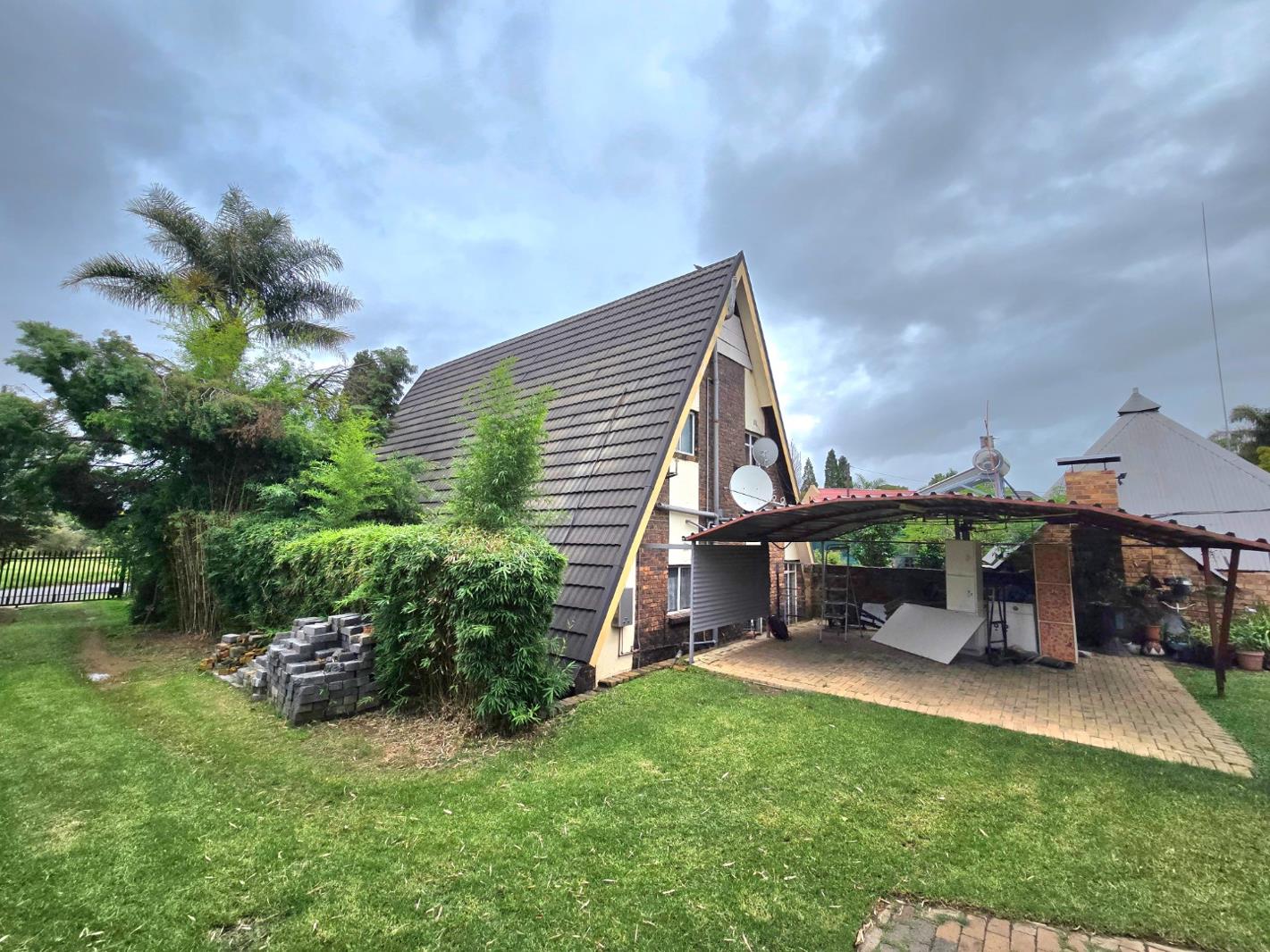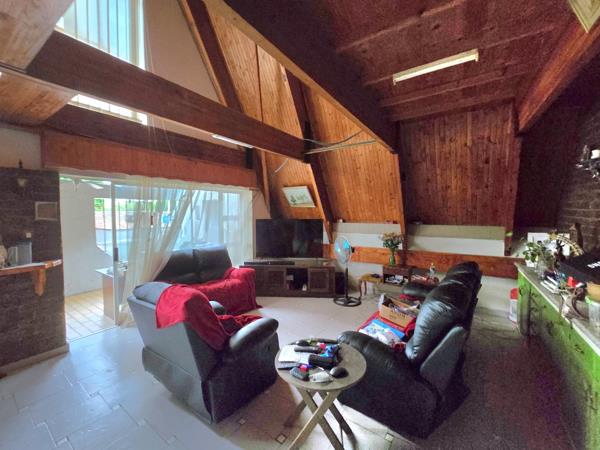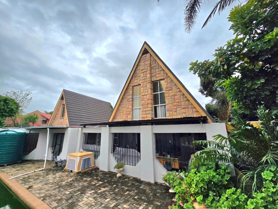 This stunning A-frame home offers a one-of-a-kind living experience with its distinctive design and spacious layout. The main house features three bedrooms, with the main bedroom boasting an ensuite bathroom for added comfort. The open-plan dining and lounge area creates a seamless flow, complemented by a well-equipped kitchen. Outdoor living is a dream with a covered patio, lapa, and a sparkling swimming pool, perfect for entertaining. Parking is ample, with two carports and a garagethe latter offering easy conversion into a single-bedroom house.