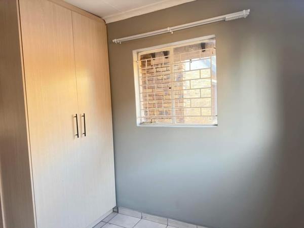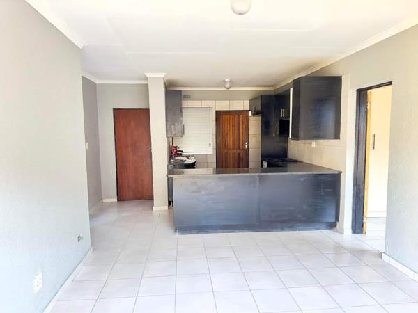 Neat townhouse in a secure complex close to all amenities and schools offering open plan living area and kitchen, two bedrooms, a bathroom, a single garage, and a single carport.