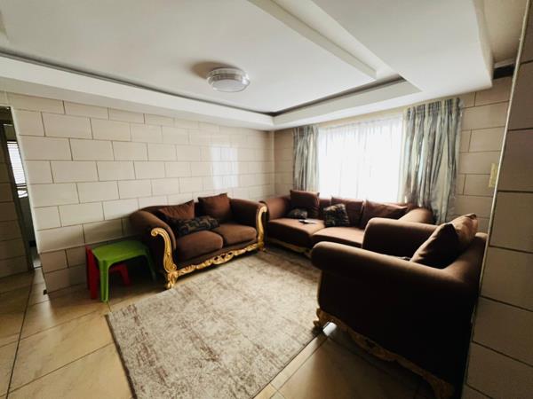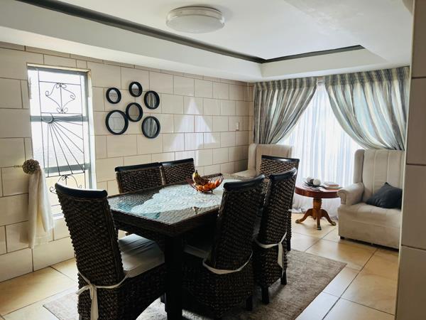 It features 3 spacious bedrooms, all with built-in cupboards. The home is fully tiled and fitted with beautiful ceiling boards. The kitchen offers ample cupboard space and flows into the lovely lounge and a private dining area.