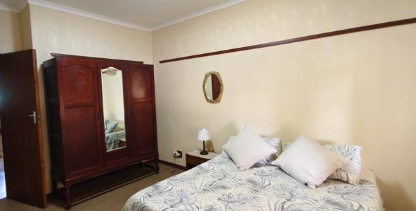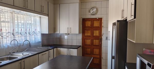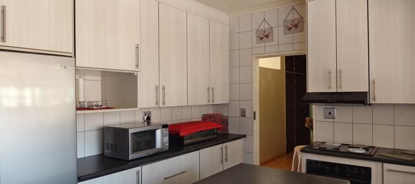 The modern kitchen is well designed with ample cupboard space. The enclosed stoep has been remodelled into a practical laundry room with space for both a washing machine and tumble dryer.