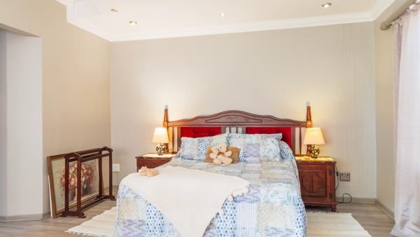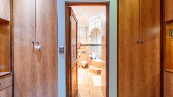 The lengthy passage leads you to the main bedroom with access door into the garden area between the bedroom and the undercover veranda. On your way to the en-suite bathroom you find the built-in cupboards on both sides with dressing table and mirror. This bathroom has the full Monty with shower, corner bath, double basin, bidet and toilet.