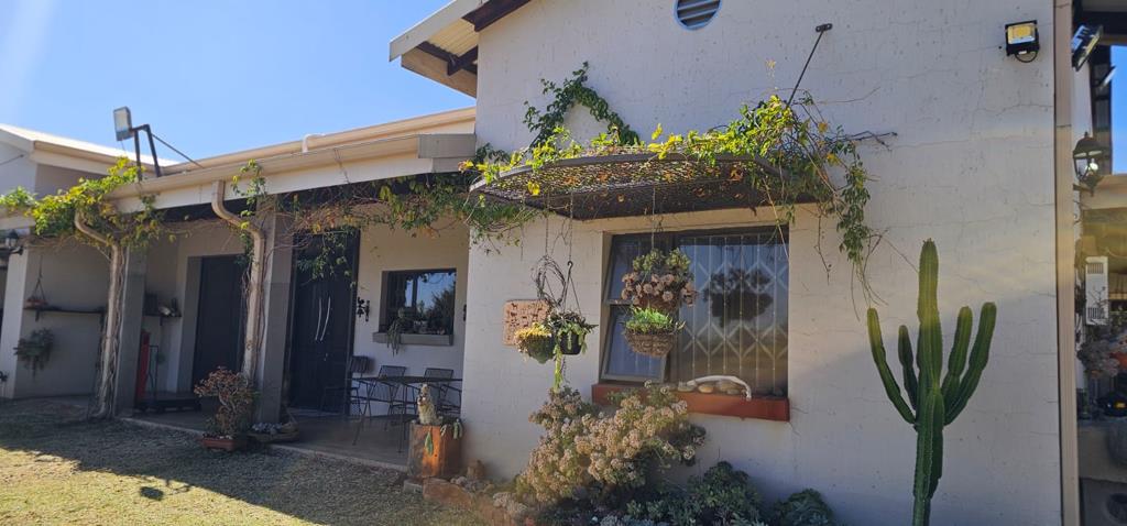 The property features lush, irrigated gardens with an extensive collection of cycads, succulents, and aloes, making it a paradise for birdwatchers. A serene stream and multiple ponds with water lilies add to the tranquil setting.