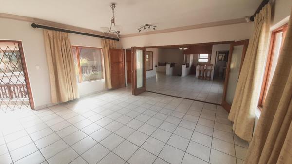 The main floor features an open-plan dining and lounge area, seamlessly integrated with a solid cherry wood gourmet kitchen. Equipped with a double oven electric stove and ample storage space, it is ideal for culinary enthusiasts. The downstairs area extends to a covered braai area, perfect for entertaining or enjoying family gatherings. Additionally, a separate study offers a dedicated space for work or leisure.