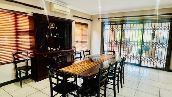 The open-concept dining area flows into a large kitchen equipped with a gas stove and two ovens. This space opens to a covered braai area that overlooks the stunning Magalies Mountains and the swimming pool. The inviting lounge includes a fireplace and sliding doors that lead to the garden, with convenient access to two automatic garages just steps away from the dining room.