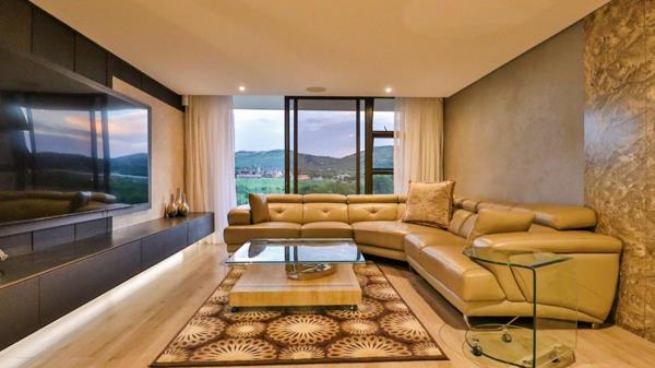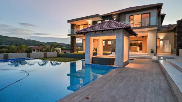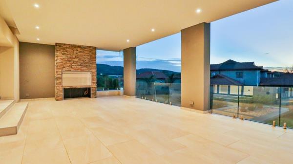 The striking exterior has covered patios and braai areas with views of a well-manicured garden and yard. You will find a hypnotic swimming pool that gives the illusion of an overflow with a Jacuzzi tucked away beneath the pergola. For those relaxed outdoor family evening moments by the fire, one has the advantage of a boma.