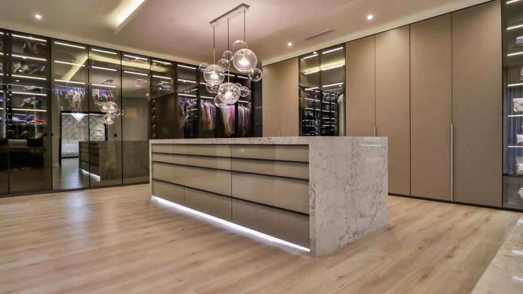 Those with a discerning taste in splendor will adore the master bedroom that features its own pajama lounge upon entry with a private balcony. This room has generous floor space, a complementary headboard design, center ceiling chandelier, strip cove lighting and perfectly placed air vents. The superb walk-in closet features a closet island which offers both functional storage and aesthetic appeal, has slightly tinted glass wardrobe doors with lights and alluring strip cove wardrobe lighting, that together with the pendant light above the island provides exquisite illumination.