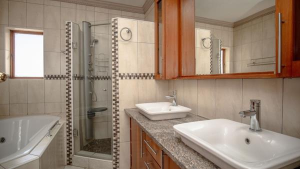 The down stairs area also leads to the braai area which is under cover. the master bedroom boasts with a walk - in closet, office area and a spa bath tub. the second bathroom is also en-suite.