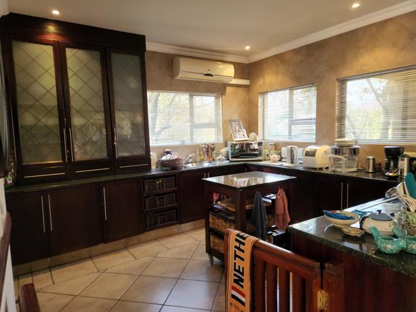To the right, a spacious guest bedroom awaits, which can easily serve as a complete bachelor''s suite for two. This well-appointed space features a living room and a large en-suite bathroom, with sliding doors that lead to the garden. On the left, the open-plan living areas beckon, including a dining area, a TV lounge with a cozy fireplace, and a sunlit lounge where you can savor your morning tea or enjoy afternoon lunches. The kitchen, a true chef''s delight, is equipped with a large pantry, a separate wash-up/scullery, marble tops, and a breakfast nook.