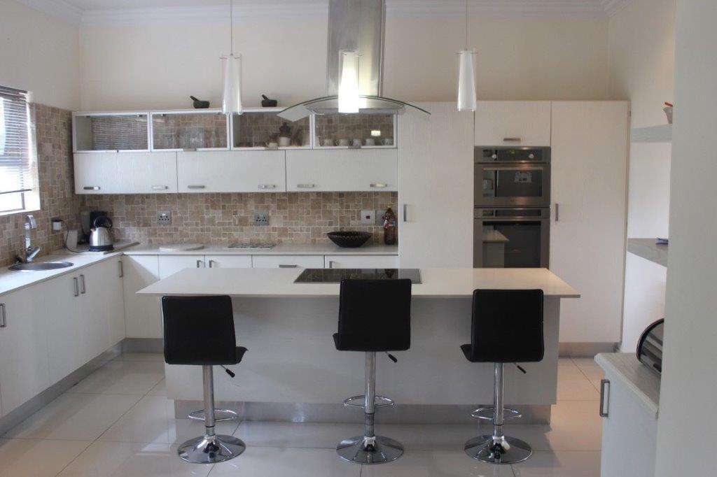 The open plan kitchen is a sight to behold, boasting ample cupboard space, stunning granite countertops, a center island with an oven and hob, and an extractor fan. The practicality and functionality of this exceptional home are further enhanced by a separate scullery and servant''s quarters.