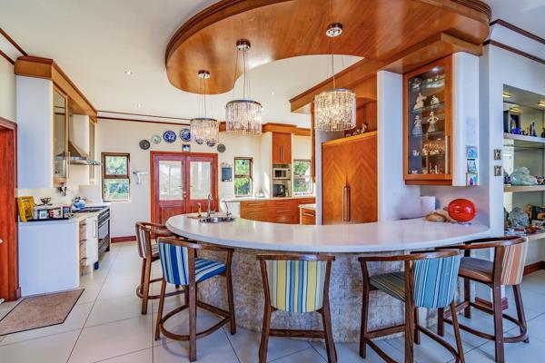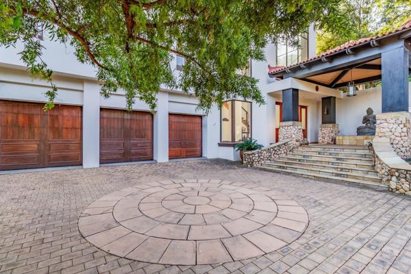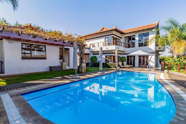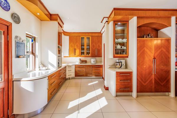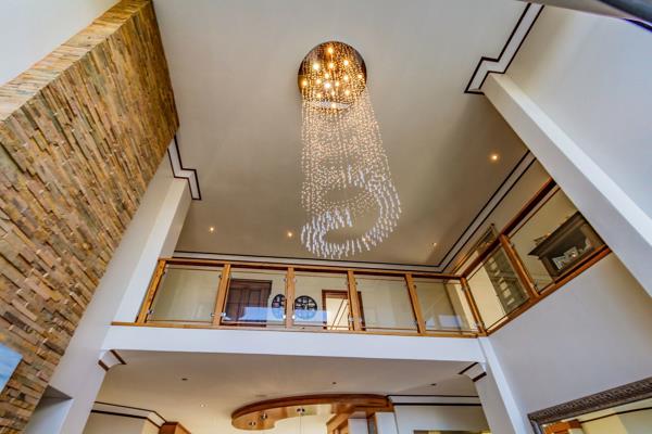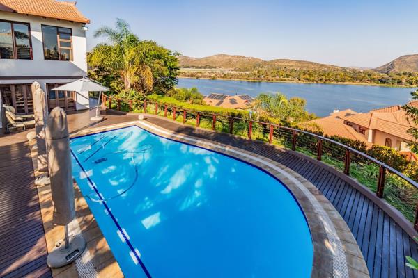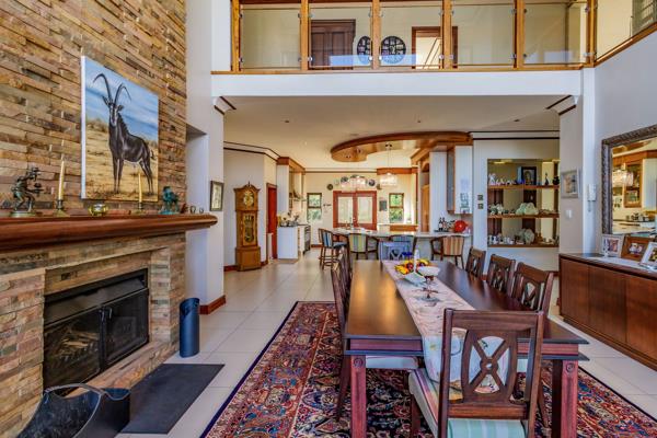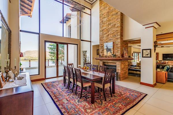 The main house''s large open-plan design includes an informal lounge with a fireplace, a private lounge, and a double-volume dining room adorned with a modern, sophisticated chandelier. These spaces open onto an undercover, expansive entertaining area with a built-in braai, overlooking a sparkling swimming pool and scenic views of the dam and mountains. The modern kitchen, equipped with state-of-the-art appliances, features a separate laundry and scullery and opens onto a magnificent garden with water features and lush green trees.