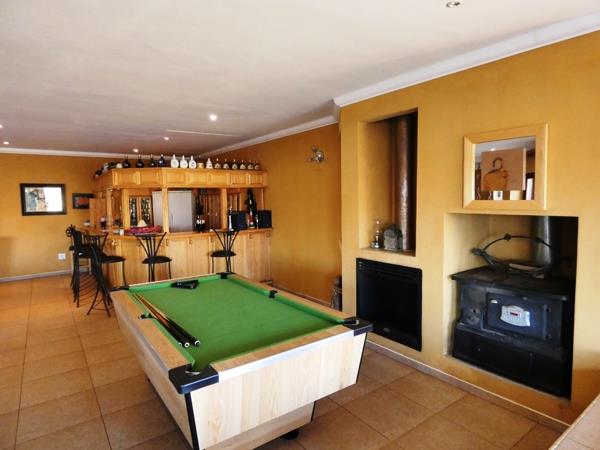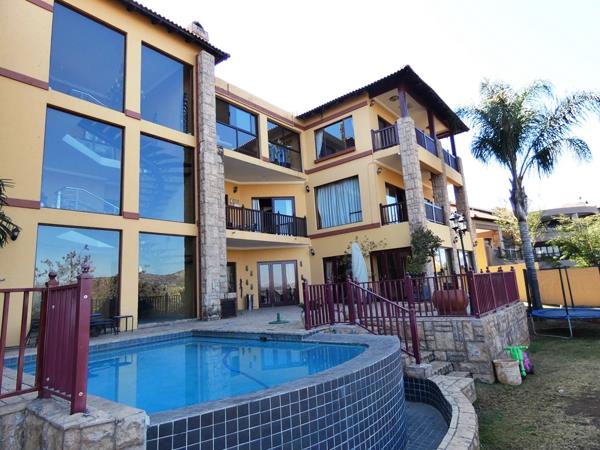 Downstairs have a huge separate entertainment area with a kitchenette and Jaquizzi, sliding doors opens up onto a patio area with built in braai and sparkling pool - 2 Bedrooms and a gym room is also this level. The main bedroom is upstairs with a ensuite bathroom and boasts a private balcony from where you can enjoy an awesome uninterrupted view of the beautiful Hartbeespoort dam, on the same level there is also a separate living area and another 3 bedrooms.