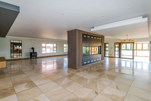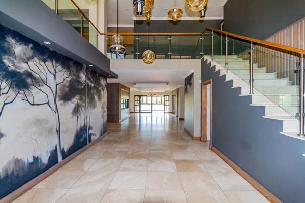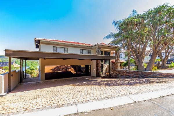 The entrance level welcomes you with an impressive open-plan layout featuring a sleek, modern kitchen equipped with state-of-the-art appliances, a separate scullery, and a laundry room. The stylish dining area flows effortlessly into a spacious lounge that extends to a covered entertainment patio with built-in braai, perfect for relaxed gatherings while enjoying the stunning dam views.