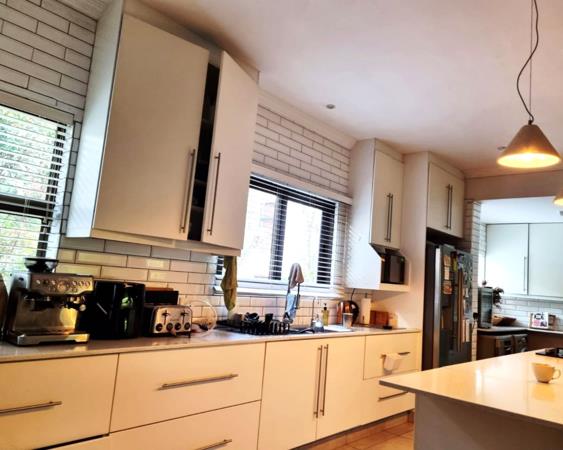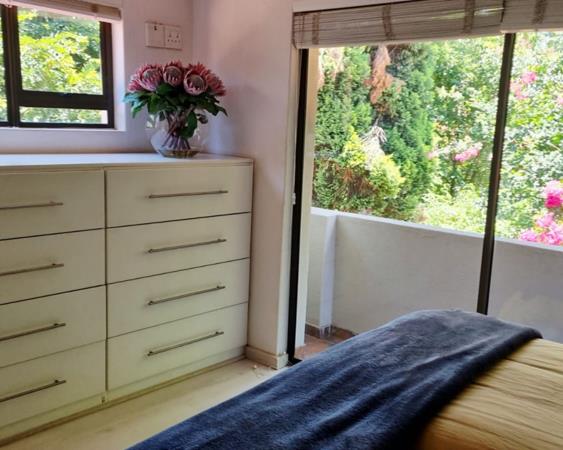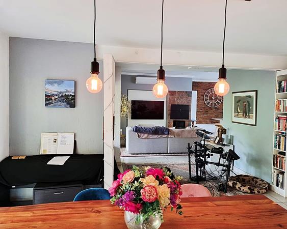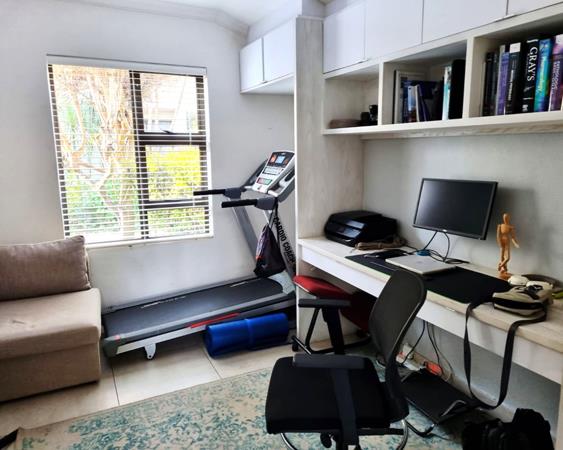 This is a modern 3-bedroom double story complex with a contemporary feel, open plan spaces and modern finishes that provides an abundance of storage space with plenty of cupboard space as you enter the home at the front door ideal to store yours and your guests shoes, hats, jackets or sports equipment. This incredible home features air-conditioned rooms with built-in cupboards, wooden flooring and an abundance of natural light. Each room has quality custom blinds, so no curtains are needed. There are two bedrooms upstairs, the main bedroom and 2nd bedroom is en-suite, while the second bedroom has a built-in bookshelf and built-in desk with cabinets. As you make your way downstairs you are welcomed by a third bedroom that has been converted into an office space and consists of a built-in table with bookshelf on the top as well as built-in cupboards so one can use this as bedroom that can accommodate a double bed, or if you have kids and would like to add bunk beds.