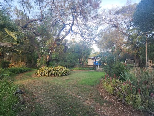 Spacious Family Home: A comfortable 3-bedroom, 2-bathroom home featuring a double garage, a charming lapa, and a large generator for backup power. The property is surrounded by lush gardens, expansive green lawns, and mature trees, creating a serene countryside setting.