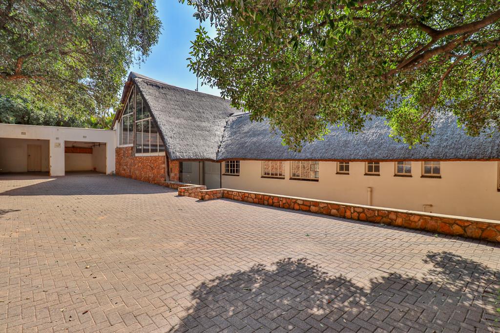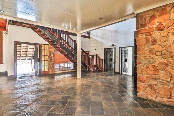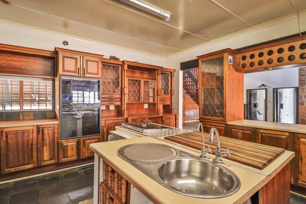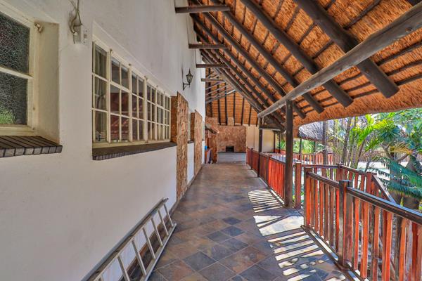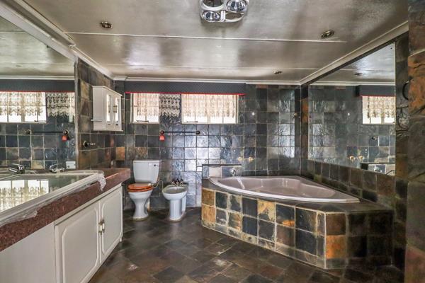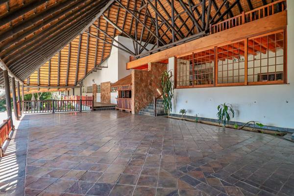 On entering the house form the double door garage you are met with a reception room and water feature. Then a big open plan dining area with serving hatch. The kitchen is equipped with a stove, double oven, built-in wooden cupboards and a big separate scullery. There is a spacious office/lounge on the Mezzanine overlooking the patio and entrance hall of the house. There are two courtyards of which one is surrounded by 5 bedrooms all have built-in cupboards and two have en-suite bathrooms, and a tv lounge with a fireplace. The second courtyard has a boma and braai area with a door approximately 4 meters from the jacuzzi. The main bedroom has an en-suite full bathroom and urinal, walk-in safe room and separate sun room. There are an additional 2 single toilets (one with a basin), a single Bath with a basin and a single shower.